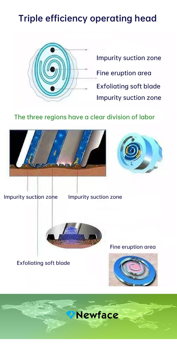 Principle Combine the vacuum negative pressure screw head, fully combine the micro bubbles with the proprietary stock solution, use the spiral suction head to directly act on the surface of the skin, open pores, soften cutin,deeply clean, replenish water and