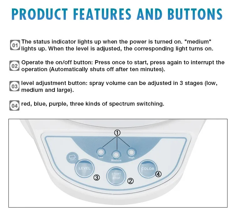 1.Ultrasonic wave of 110KHZ produces nanometer spray, also known as "spray"