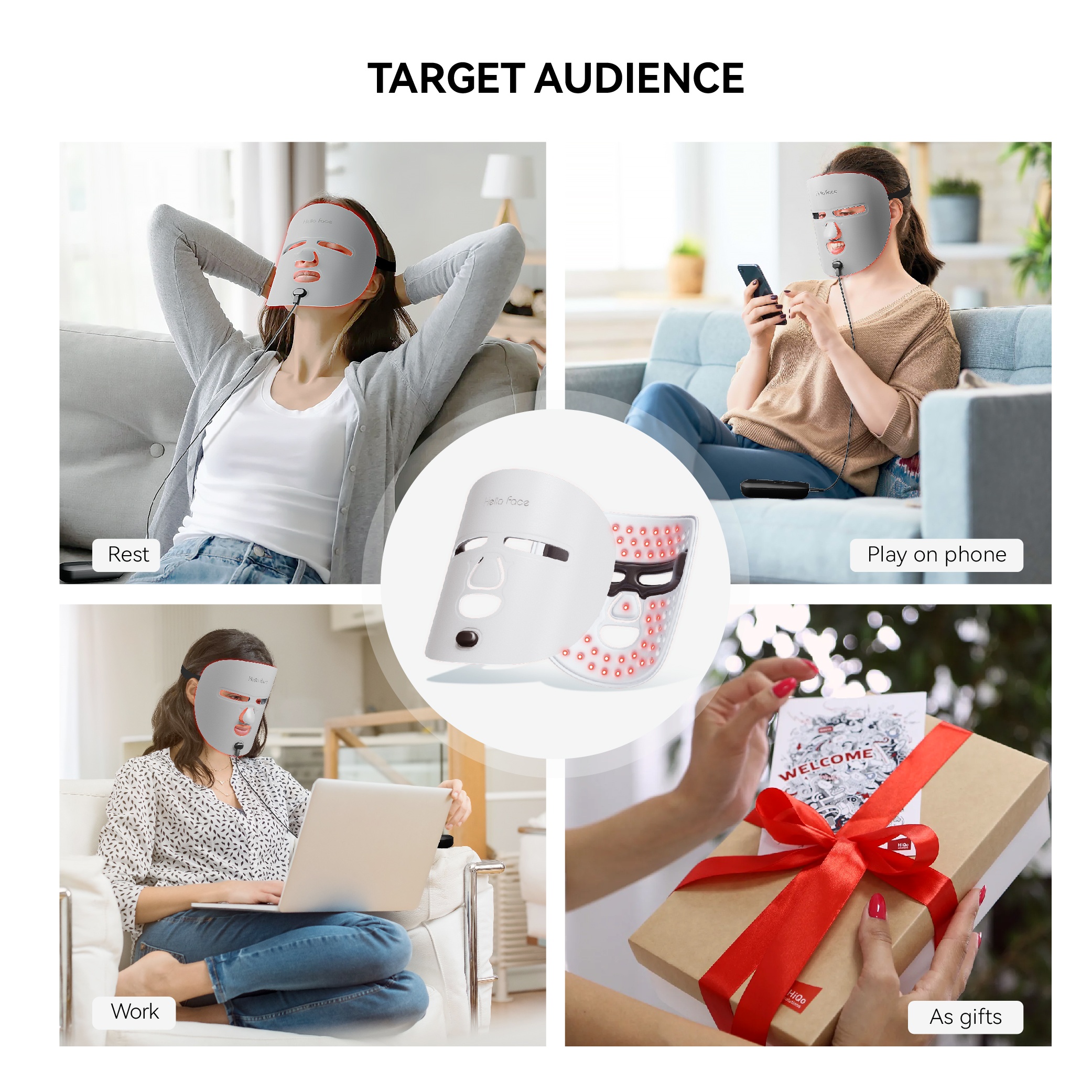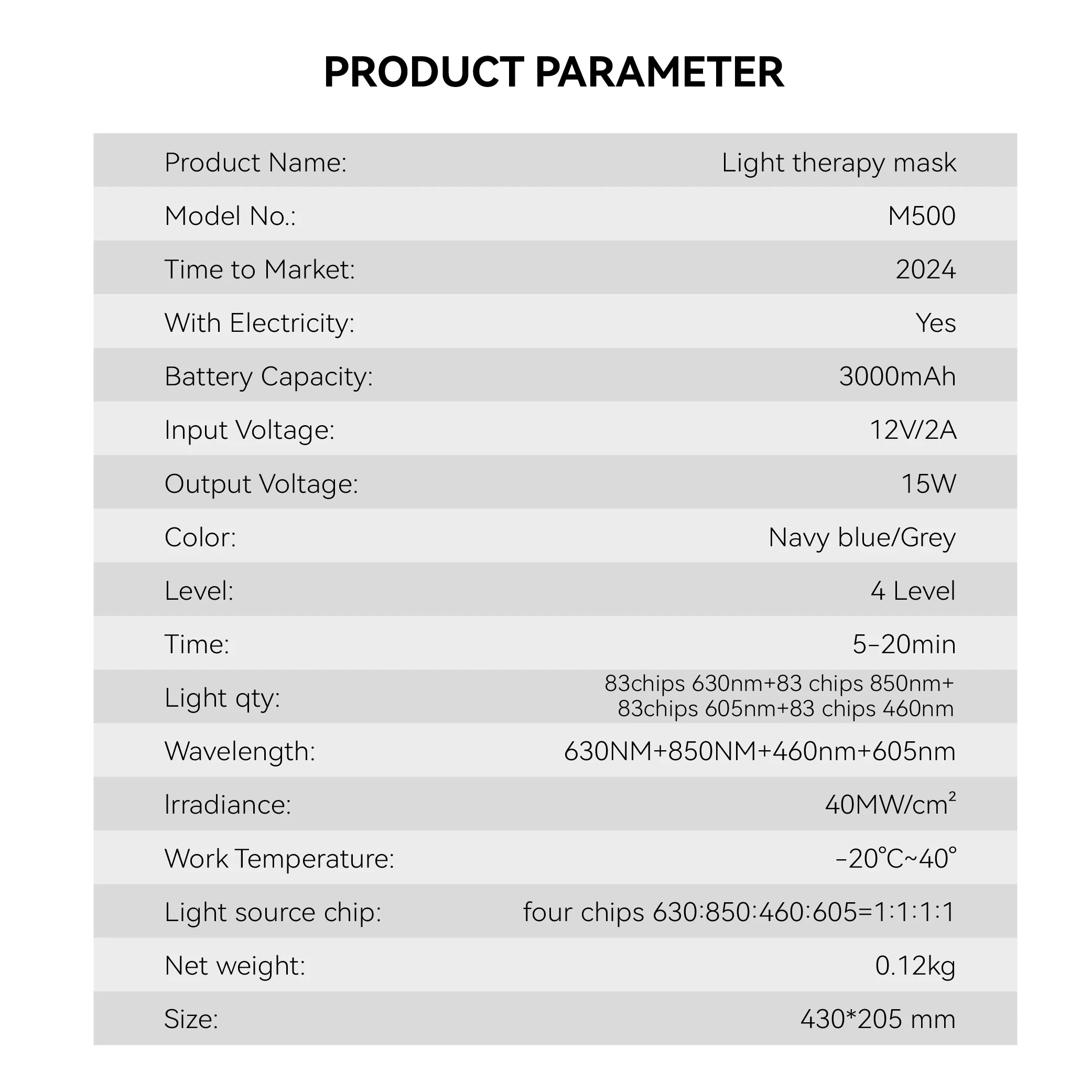 Specifications: Material: Lightweight, skin-friendly fabric Battery Life: Built-in 3000mAh battery for extended use Design and Style: Ergonomic with honeycomb light source structure for safety Usage and Purpose: Near-infrared LED Light Therapy for anti-aging and skin repair Performance and Property: 4-Core LED Beads with 83 Light Positions for comprehensive skin care Accessories: Adjustable elastic straps for a comfortable fit Features: |Skin-friendly Mask| **Revolutionary Skin Care Technology** The Hello Face Near-infrared LED Light Therapy Face Mask M500 is a cutting-edge beauty device designed to rejuvenate your skin with its advanced light therapy technology. This super lightweight mask, weighing just 120g, is engineered with a honeycomb light source structure that ensures 8-level temperature protection, safeguarding your skin from any potential harm. The mask's ergonomic design is not only comfortable but also ensures that your eyes are shielded from any light leakage, making it a safe and effective solution for all skin types. **Versatile and User-Friendly** With its 3000mAh battery, this LED beauty device offers extended standby time, meaning you can enjoy your skin-care routine without the need for additional power banks. The mask's three modes and five to twenty-minute session durations allow for personalized and flexible use, making it an ideal tool for various skin care needs. The adjustable elastic straps ensure a comfortable fit, allowing for repeated use without the need for readjustment. The mask's skin-friendly fabric is not only luxurious but also gentle on your skin, ensuring a delightful experience during each session. **Clinically Proven Results** The Hello Face M500 mask is a medical-grade device that uses optimized doses of red light and near-infrared to stimulate collagen production, reduce inflammation, and diminish the appearance of fine lines and wrinkles. It is an excellent solution for individuals seeking to improve their skin's texture, reduce acne, and promote a healthier, younger-looking complexion. The mask's design and performance are clinically proven to enhance your natural skin's ability to heal and repair, offering a non-invasive, pain-free, and side-effect-free approach to skincare. Embrace the radiant beauty within with the Hello Face Near-infrared LED Light Therapy Face Mask M500.