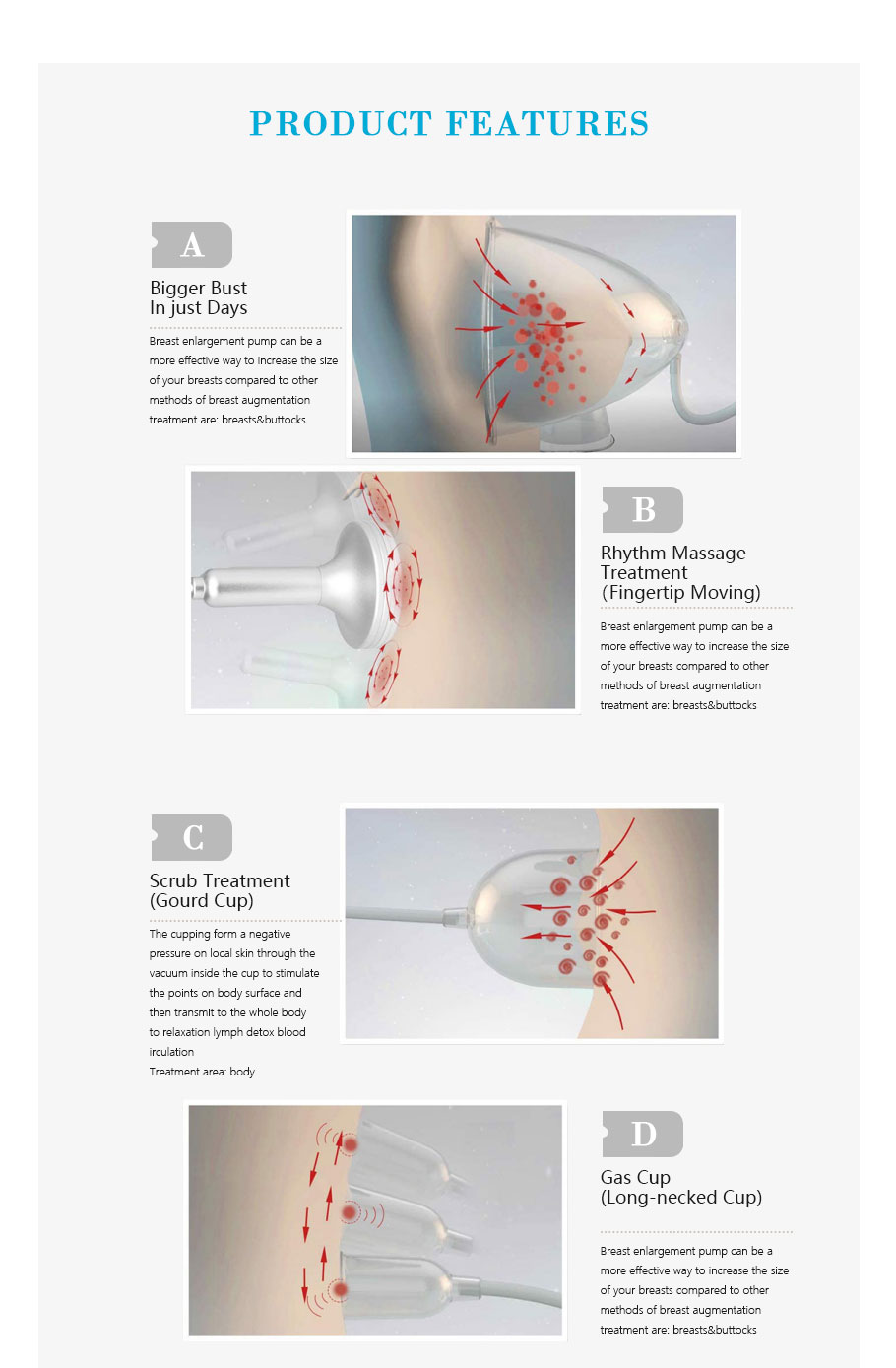 1. The specially designed vacuum pump can quickly improve the size and shape or breast without any pain and health threats. It does not involve silicon injection or push and fill bras, it will make you have a natural and beautiful breast during the physiological period.