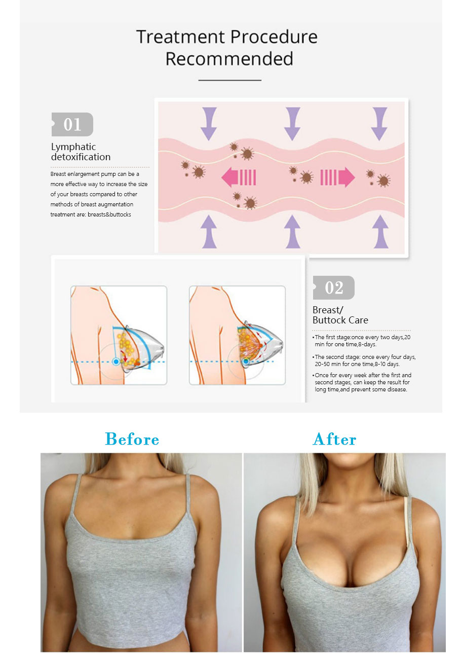 2. The vacuum pump absorbs fat particles and liquids into the breast tissue and cells, making the breast more developed.3. Purify the lymphatic system, repair skin pores, reshape skin, improve microcirculation, enhance collagen elasticity, enhance sagging muscles, anti-wrinkle, activate skin, remove eye bags and double jaws, eliminate wrinkles and telangiectasia, treat health.4. Stimulate the pituitary to produce hormones, enhance muscletissue elasticity and fiber, restore breast elasticity and softness, enhance and develop breasts, improve breast