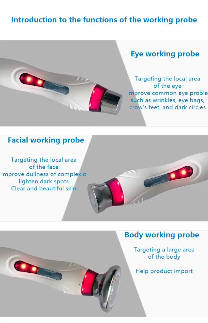 Micro current (EMS), electric skin lifting and blue light therapy. It is suitable for beauty salon and home use. It has a powerful built-in intelligent control system. The adjustment of the three major functions of radio frequency, micro current and massage can realize customized classification of skin care for the forehead, eye area, face, jawline, neck, back, abdomen, legs, arms and other parts. At the same time, it has an intelligent time control system, which can customize the working time to meet different needs; among them, the three modes of electric skin lifting can be superimposed with radio frequency, micro current and blue light to enhance the skin beautification effect.