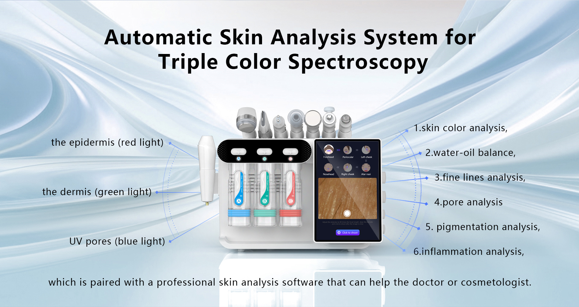 Water Skin Intelligent Analysis extracts skin pictures from the epidermis, dermis, and UVpores, and automatically analyzes 6 major skin problems. lt supports tens of millions of data libraries, can add products, and transmits the results via BluetoothCombined with the vacuum negative pressure spiral head, ultra-fine bubbles and exclusiveoriginal liquid are fully combined, and the spiral suction head directly acts on the surfaceof the skin, opening pores, softening cuticles, deep cleansing, hydrating and othermulti-lavered effects.