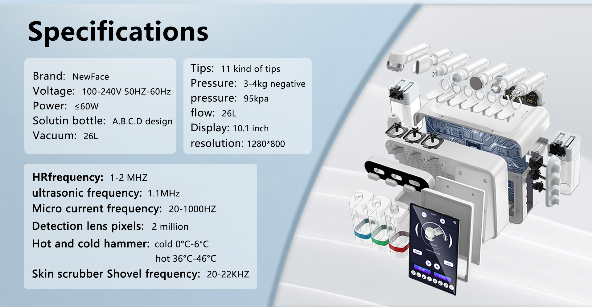 The temperature wave lifts and tightens the skin, and the vibration atomization istransmitted to the skin at a vibration frequency of 1 milion to 3 million times per minute,which is absorbed by the epidermis, dermis, and subcutaneous tissue and converted intoheat, making the product's absorption rate reach more than 90%.The intelligent water and muscle analyzer has a tablet design and can be freely removedand removed, making it better and more convenient to identify and improve skin problems