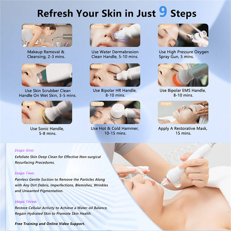 Through the formation of a vacuum circuit, the tiny bubbles and nutrient solution are fully combined, through a special design of spiral suction directly acting on the skin surface,the instrument produces thousands of bubbles, small bubbles with the skin contact vibration, the skin takes away the excess cuticle, so that the skin to return to normal angle Layer thickness, with the original solution, to improve the skin, clean and whitening, tonic,exfoliate, remove blackheads oily skin and other multi-layer effects.