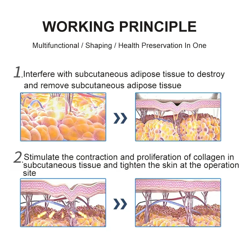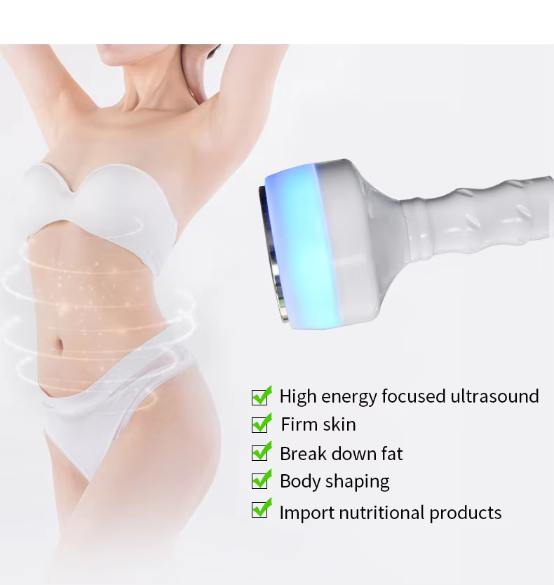 Powerful targeted fat blasting,fat removal,the use of concentrated sound waves hair frequency up to 80000 HZ strong sound Waves,extreme vibration.Move adipose cell,hit adipose cell forcibly,make adipose cell membrane produces introverted blast,make glycerine triglyceride decomposes glycerine. And free acid,cause adipose cell burst,achieve the effect that reduces weight thereby beauty body.