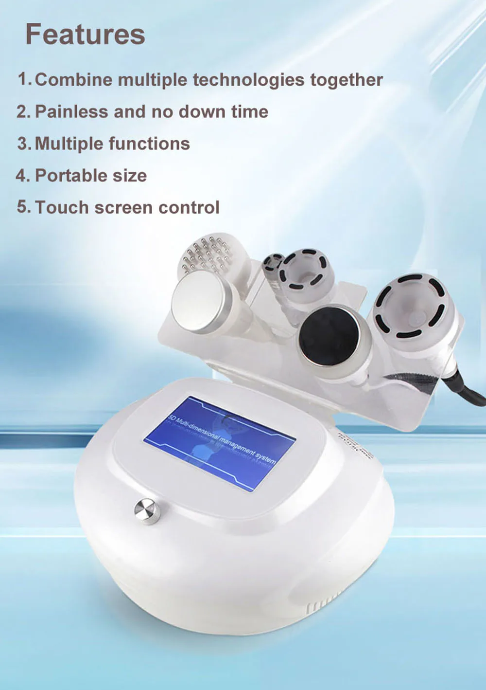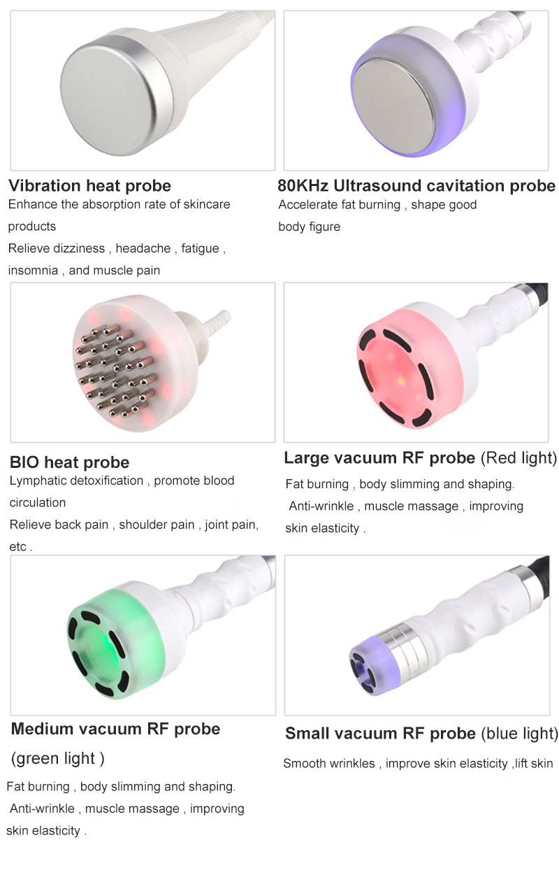 The machine combines multiple technologies together, including 80K cavitation, RF, vacuum, BIO and heating. It can reduce fat, stimulate collagen production to build more shapely body figure, tighten and lift skin. Moreover, it can relieve muscle tension, improve skin elasticity and promote lymphatic drainage.