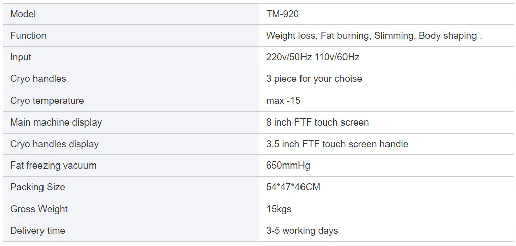 Feature highlights:The TM-920 Cryolipolysis Slimming Machine offers non-invasive, painless fat reduction with no downtime, making it a powerful alternative to liposuction. It features 3 cryo handles, a cryo temperature of up to -15°C, and an 8-inch FTF touch screen display. The machine supports multiple functions including weight loss, fat loss, slimming, and sculpting, and is equipped with a 650mmHg vacuum for effective cellulite reduction. Suitable for commercial use, it targets various body areas and comes with a 1-year warranty and multiple after-sales services like online support and video technical assistance.