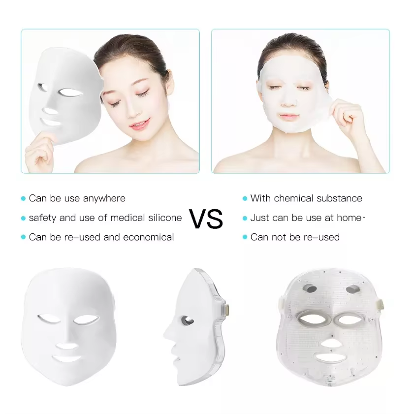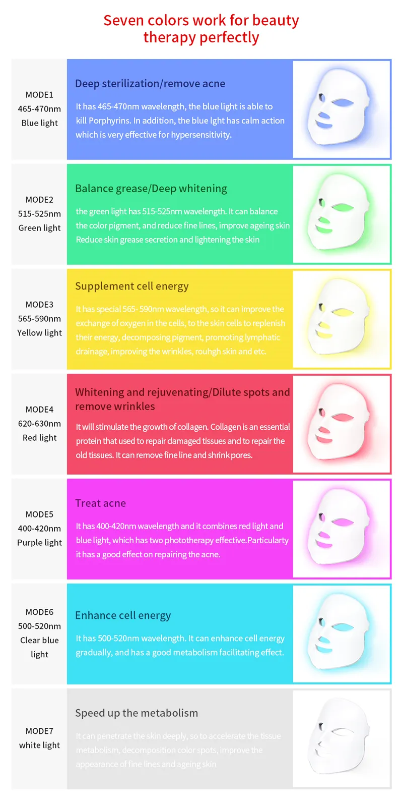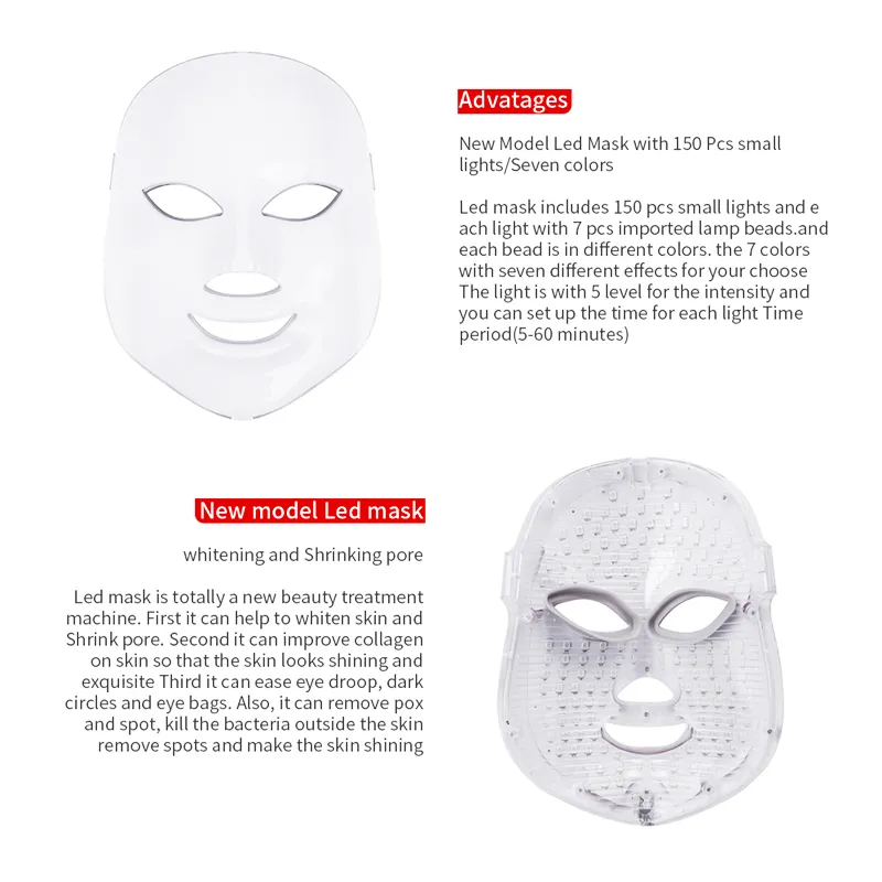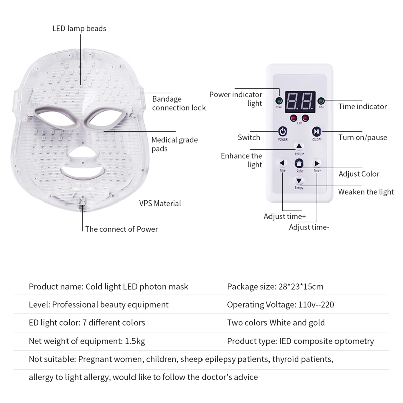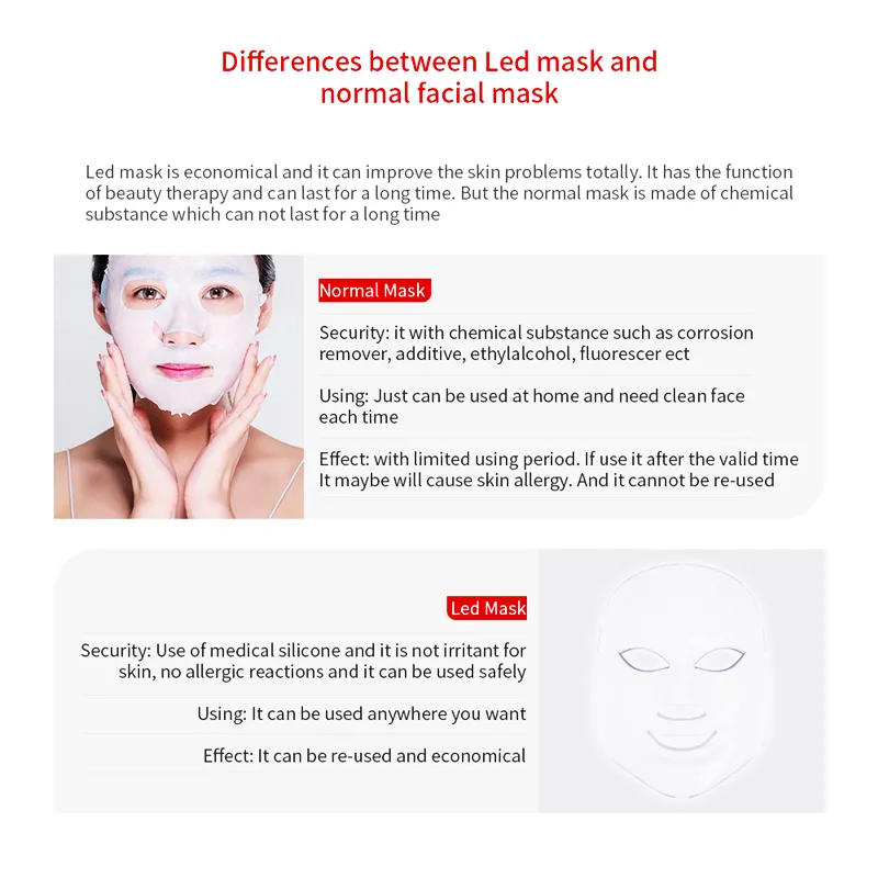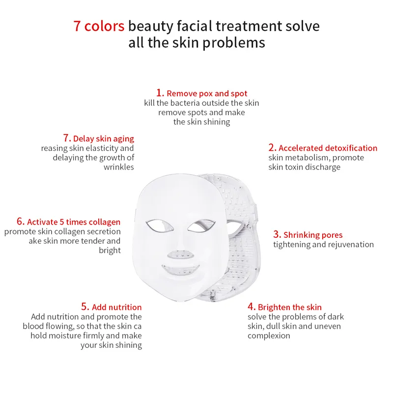 · 7 Colors LED mask can solve stubborn skin problems,like heal acne and repair the acne scar.
