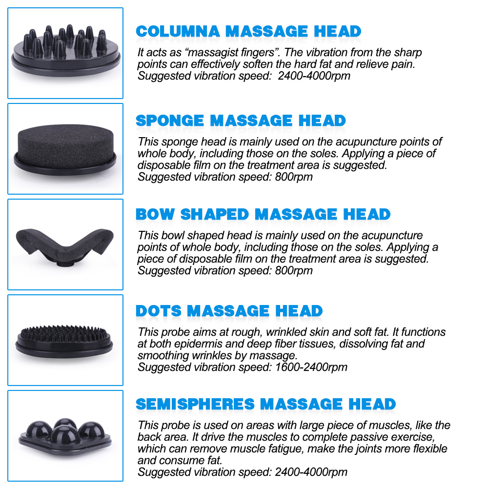 This probe is used on areas with large piece of muscles, like the back area.It drive the muscles to complete passive exercise, which can remove muscle fatigue, make the joints more flexible and consume fat.Suggested vibration speed: 2400-4000rpm