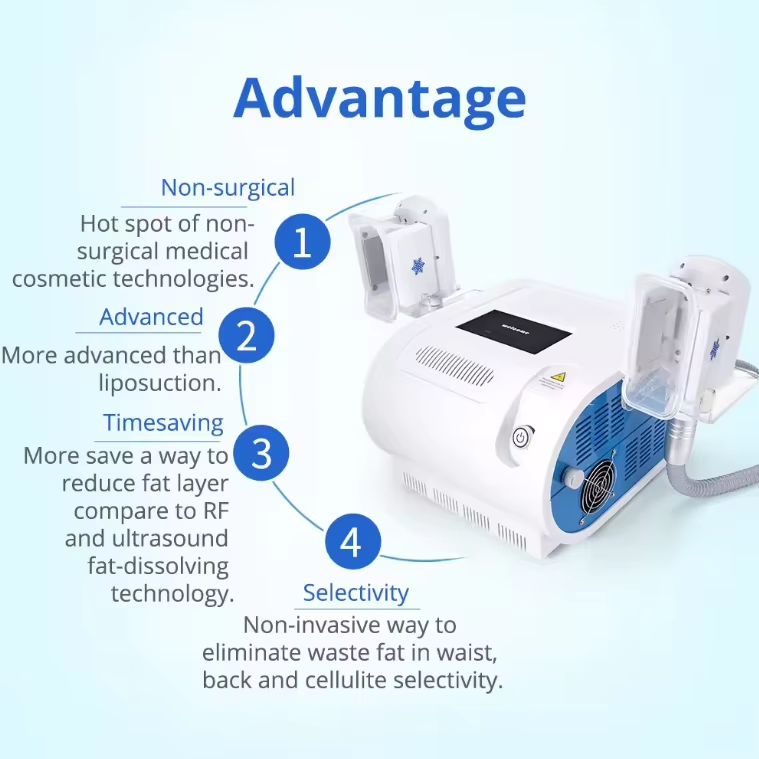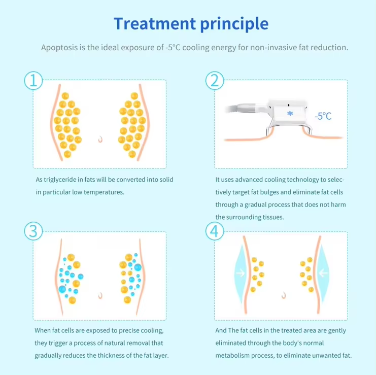 As triglyceride in cellulites will be converted into solid in particular low temperatures,It uses advanced cooling technology to selectively target cellulite bulges and eliminate cellulite cells through a gradual process that does not harm the surrounding tissues,reduce unwanted cellulite, When cellulite cells are exposed to precise cooling, they trigger a process of natural removal that gradually reduces the thickness of the cellulite layer.
